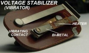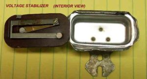 Isıtıcı/bimetal tasarımının hassasiyeti nedeniyle, göstergeye gelen giriş voltajının sabit olması çok önemlidir. Voltaj düzenlemesi, çok basit ama etkili bir tasarımla sağlanır. Aşağıda, voltaj sabitleyici veya genellikle “termik” olarak adlandırılan cihazın dış ve iç görünümleri gösterilmiştir.