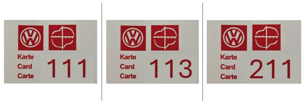 Üzerinde Volkswagen logosu bulunan etiket, araç modelini göstermektedir. Genellikle kapı direğine yapıştırılır.