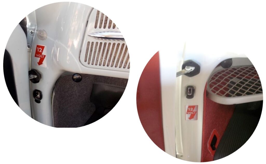 Bu kırmızı ok şeklindeki etiketler, aracın elektrik sisteminin 12 volt olduğunu belirtir. Genellikle sağ ve sol kapı direklerine yapıştırılır. Bu etiketler, elektrik hattına bakım yapan kişilere araçtaki elektrik sisteminin voltajını hatırlatmak için oldukça faydalıdır.