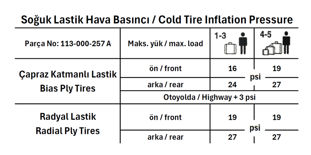 Aracın doğru lastik basınçlarını gösteren bu tablo, torpido kapağının iç kısmına yapıştırılır. Daha eski modellerde ise yakıt deposu kapağının altına yapıştırılır.