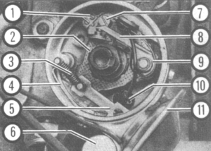 Platin ayarı yapmadan önce distribütör içerisinde hangi parçalar var tanımak gerekir. aşağıda Vakumlu tip distribütör iç mekanizması gösterilmiştir. Diğer distribütör tipleri için şu yazımızı inceleyebilirsiniz: Vosvos Distribütör Tipleri